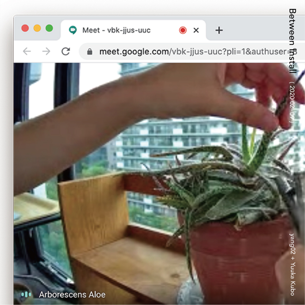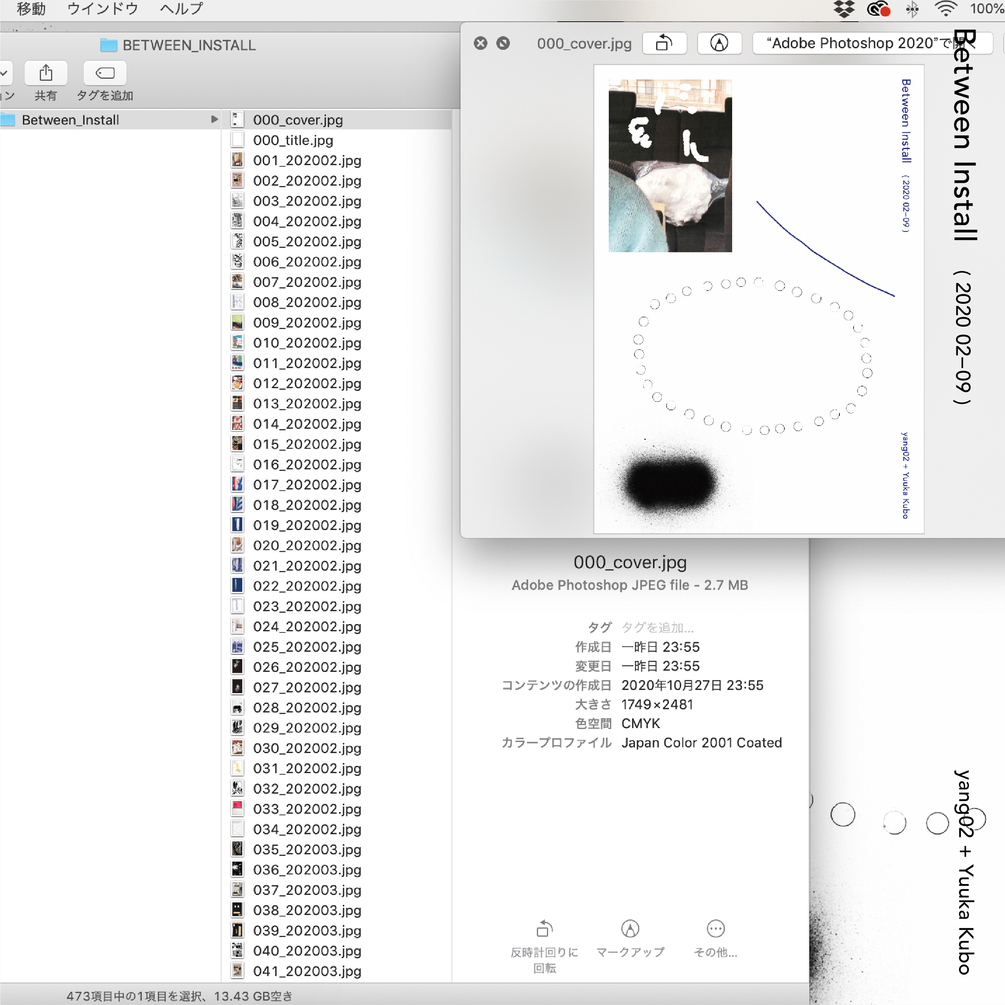 やんツーがiPhoneで撮影したスナップ写真や、PCのスクショなど、コロナ禍(2020年2月から9月まで)に記録した大量の画像データを素材に、デザイナーの久保悠香がイメージの編集と構成を手がけた、jpegデータのzineです。コロナ禍においてもほぼ変わらず、展覧会の間の準備期間(=「Between Install」設営の合間)が日常としてあったやんツーの、作品を補完する制作記録集として、或いは、色と形を造形し構成することを「愛」と捉える久保によるグラフィック作品集としてご覧ください。